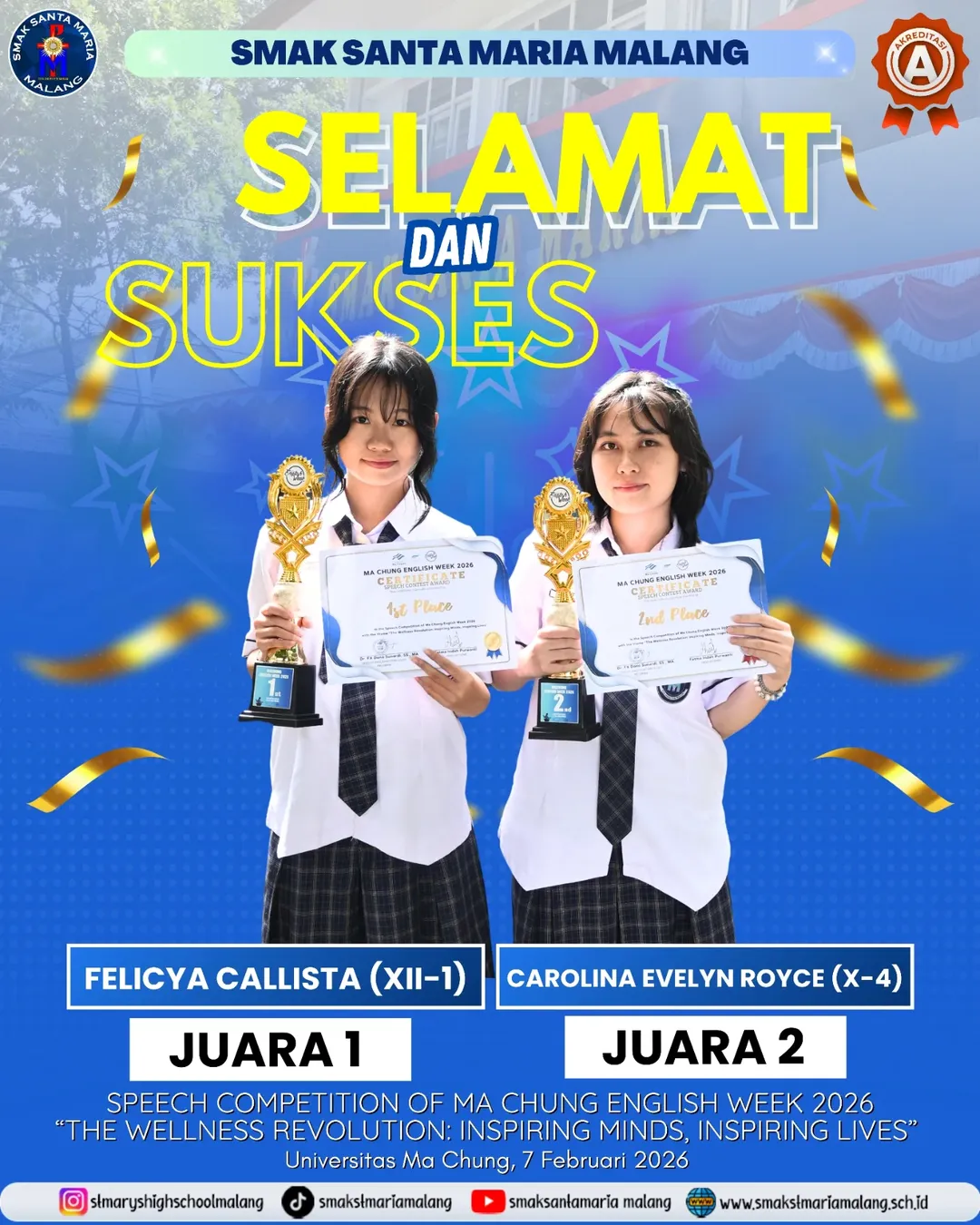 Segenap Keluarga Besar SMAK Santa Maria Malang mengucapkan Proficiat untukΒ @felicyallistΒ danΒ @lleeve.nΒ atas prestasi yang sangat membanggakan πππ€©