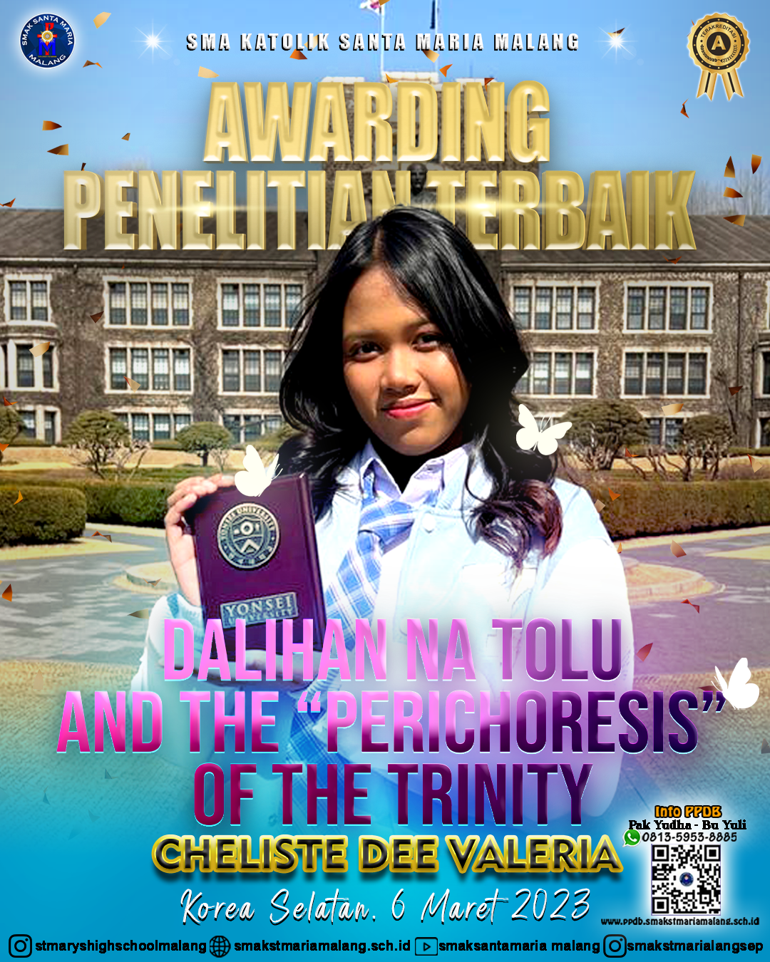 DetailsHalo warga SANMAR 👋👋👋 Syukur kita panjatkan kepada Tuhan Yang Maha Esa, salah satu siswa SMAK Santa Maria Malang yaitu Cheliste Dee Valeria kelas XII IPS 1 memperoleh prestasi membanggakan yaitu meraihAwarding Penelitian Terbaik – Dalihan Na Tolu and The “Perichoresis” of the Trinity yang diselenggarakan di Korea Selatan pada tanggal 6 Maret 2023. Semoga…