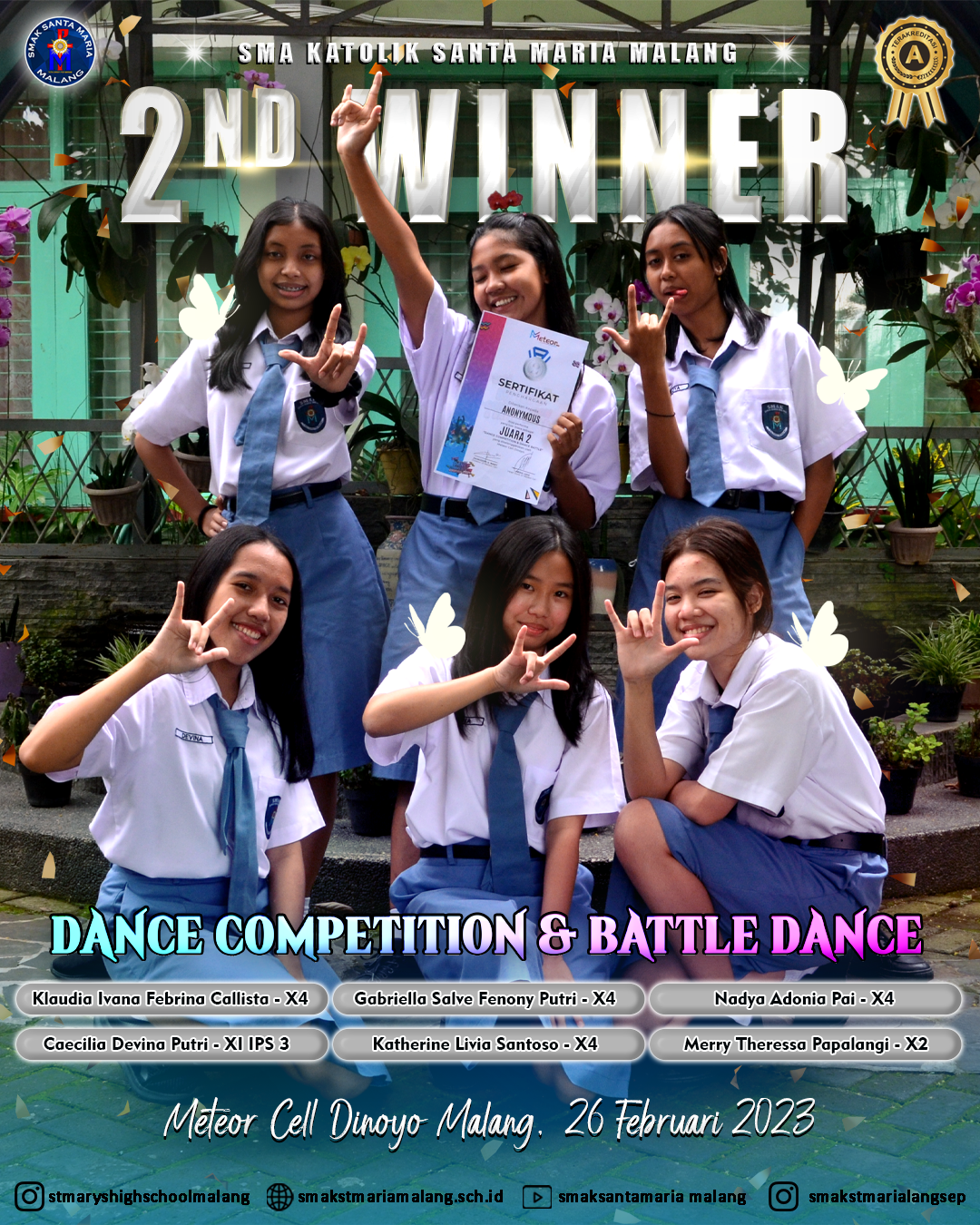 DetailsHalo warga SANMAR 👋👋👋 Syukur kita panjatkan kepada Tuhan Yang Maha Esa, beberapa siswa SMAK Santa Maria Malang yaitu : memperoleh prestasi membanggakan yaitu meraih Juara 2 Dance Competition & Battle Dance yang diselenggarakan oleh Meteor Cell Dinoyo Malang pada tanggal 26Februari 2023. Semoga mereka ber-enam semakin bersemangat dan selalu berjuang untuk mengukir prestasi membanggakan…