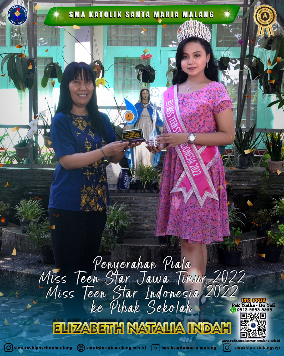 DetailsHalo warga SANMAR 👋👋👋 Kita tau bersama bahwa Elizabeth Natalia Indah ini adalah salah satu siswa kebanggaan SMAK Santa Maria Malang. Yaa…segudang prestasi telah ia raih dan selalu mengharumkan nama baik sekolah. Nah.. Tahun 2022 merupakan salah satu pencapaian prestasi terbaik Natalia, karena ia berhasil menyabet 2 gelar prestisius yaitu Juara 1 Miss Teen Star…
