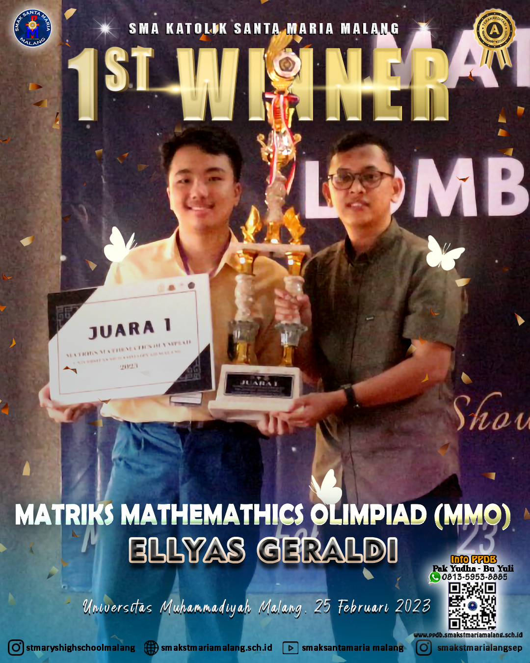 DetailsHalo warga SANMAR 👋👋👋 Syukur kita panjatkan kepada Tuhan Yang Maha Esa, salah satu siswa SMAK Santa Maria Malang yaitu Ellyas Geraldi kelas 2021 MIPA 2 memperoleh prestasi membanggakan yaitu meraih Juara 1 Olimpiade Matematika yang diselenggarakan oleh Universitas Muhammadiyah Malang pada tanggal 25 Februari 2023. Semoga Ellyas semakin bersemangat dan selalu berjuang untuk mengukir…