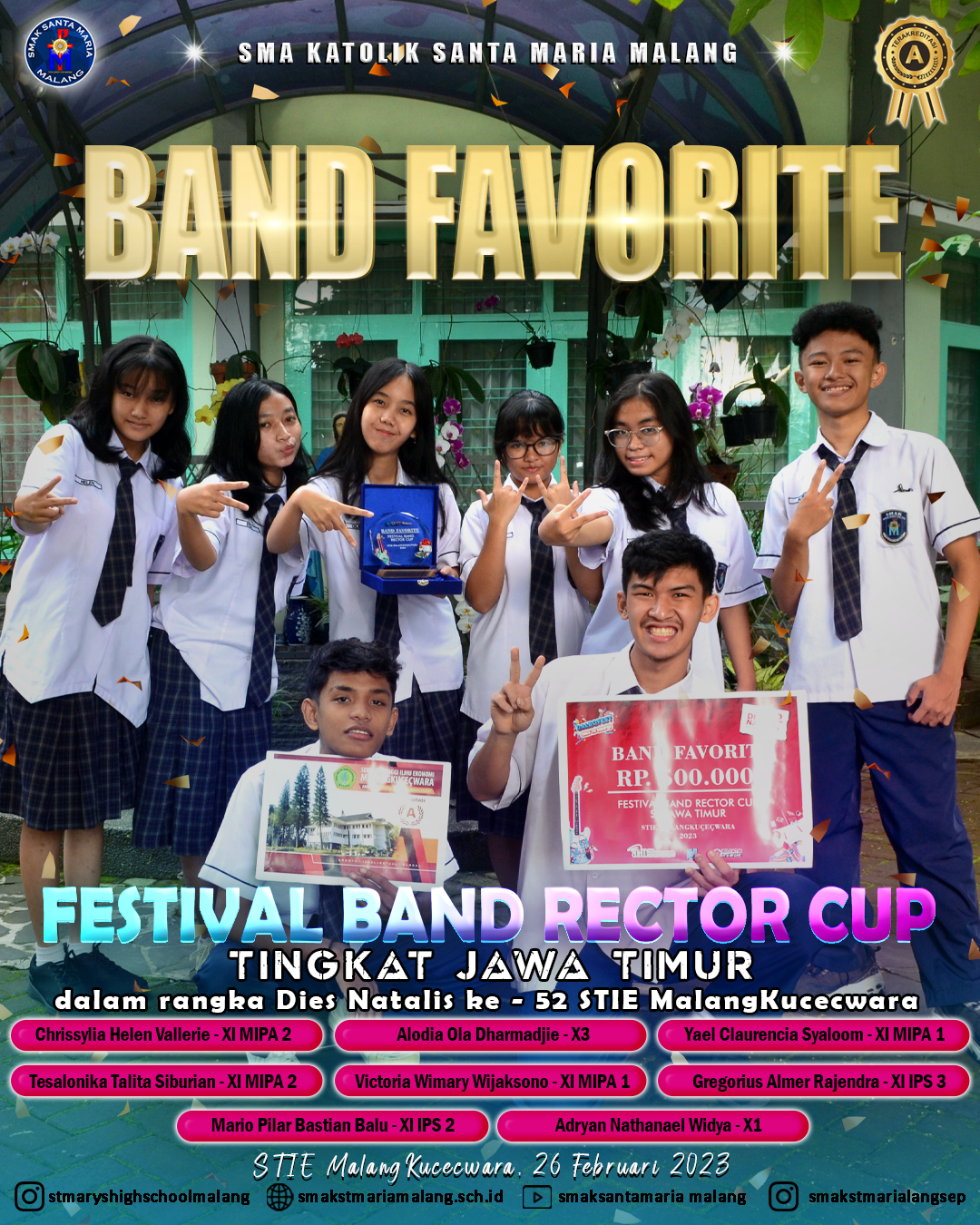 DetailsHalo warga SANMAR 👋👋👋 Syukur kita panjatkan kepada Tuhan Yang Maha Esa, beberapa siswa SMAK Santa Maria Malang yaitu : memperoleh prestasi membanggakan yaitu meraih Juara Favorit Festival Band Rector Cup Tingkat Jawa Timur dalam rangka Dies Natalis ke – 52 STIE MalangKucecwara yang diselenggarakan oleh STIE MalangKucecwara pada tanggal 26 Februari 2023. Semoga mereka…