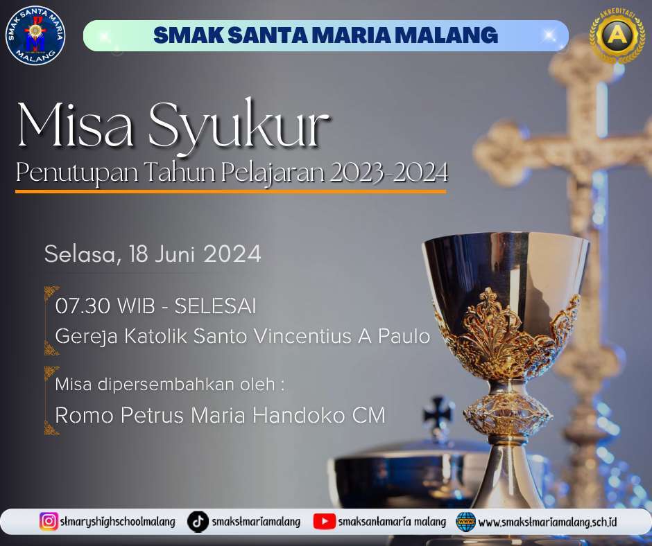 DetailsMisa Syukur Penutupan Tahun Pelajaran 2023-2024 β¨ π Selasa, 18 Juni 2024β±οΈ 07.30 WIB – Selesaiβͺ Gereja Katolik Santo Vincentius A Paulo #banggasanmar#banggasanmarmalang#hejasaintmary