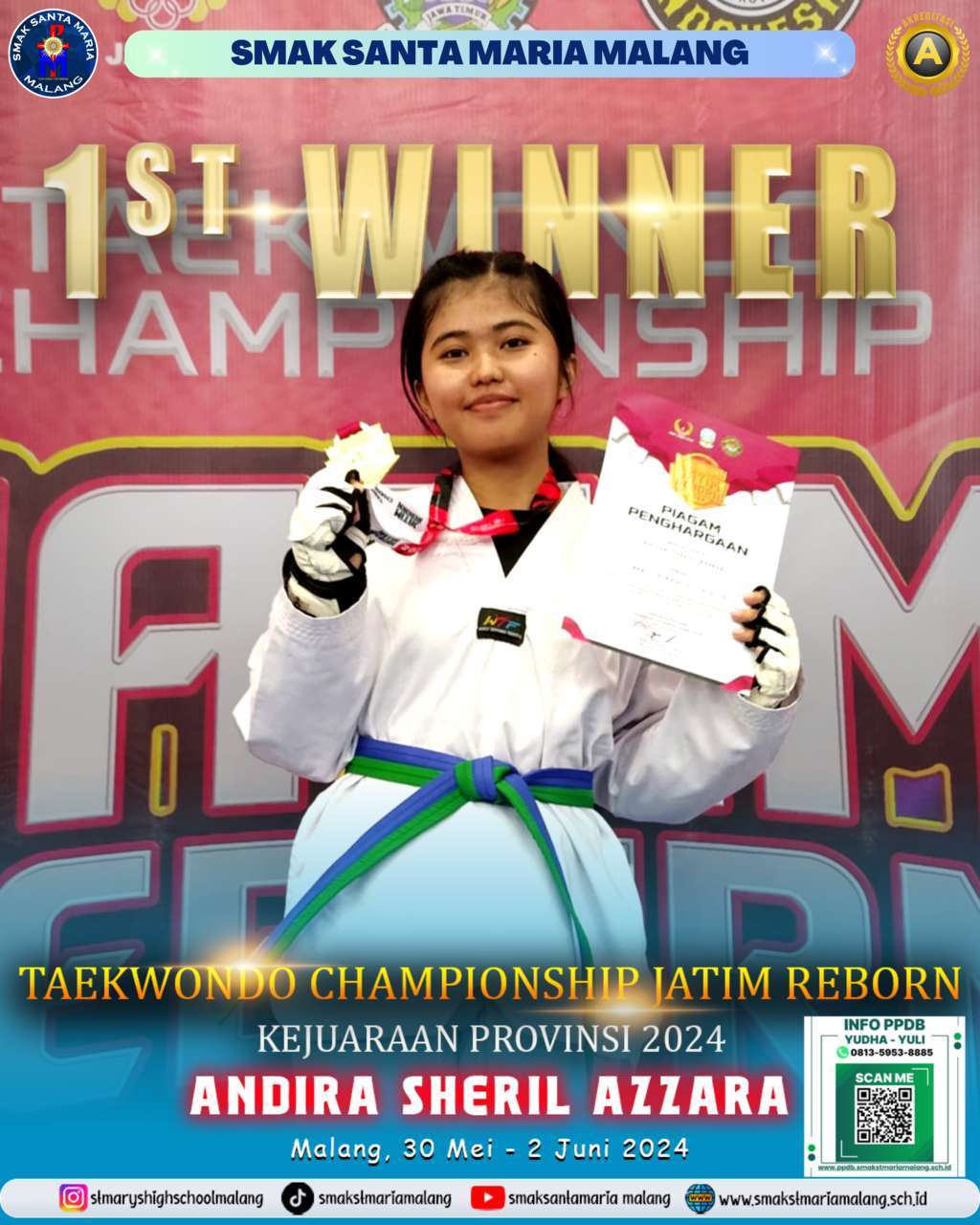 DetailsPuji Syukur kita Panjatkan Kepada Tuhan atas prestasi yang diraih oleh : β¨ Andira Sheril Azzara (Kelas XI – 1)π Juara 1 Kejurprov “Taekwondo Championship Jatim Reborn 2024”π Gor Kanjuruhan Kabupaten Malang, 30 Mei – 2 Juni 2024 Segenap Keluarga Besar SMAK Santa Maria Malang mengucapkan Proficiat untuk @shdzr07 atas prestasi yang sangat membanggakan π€πππ€© #banggasanmar#banggasanmarmalang#hejasaintmary